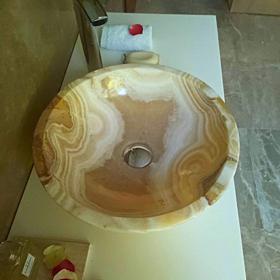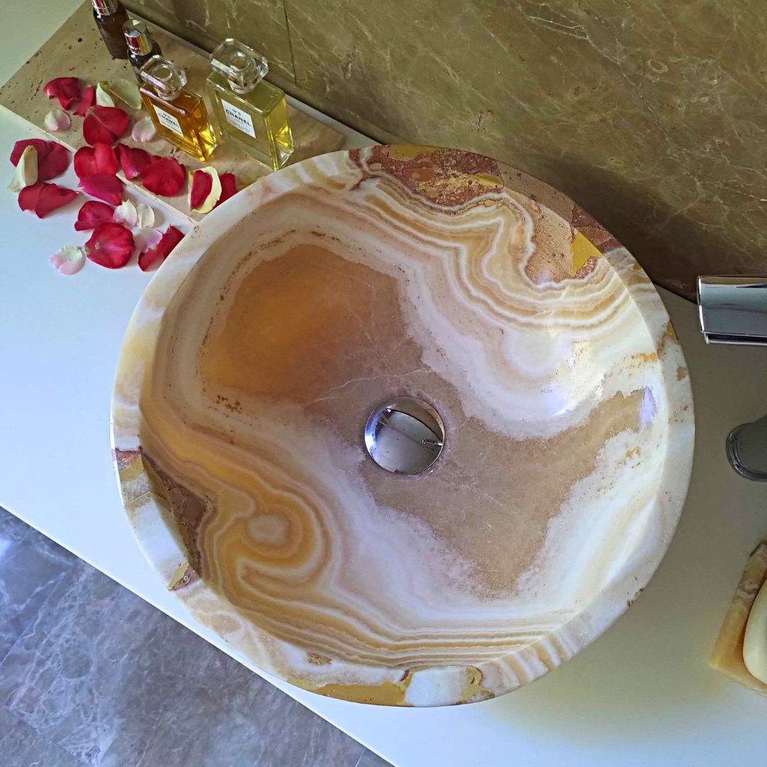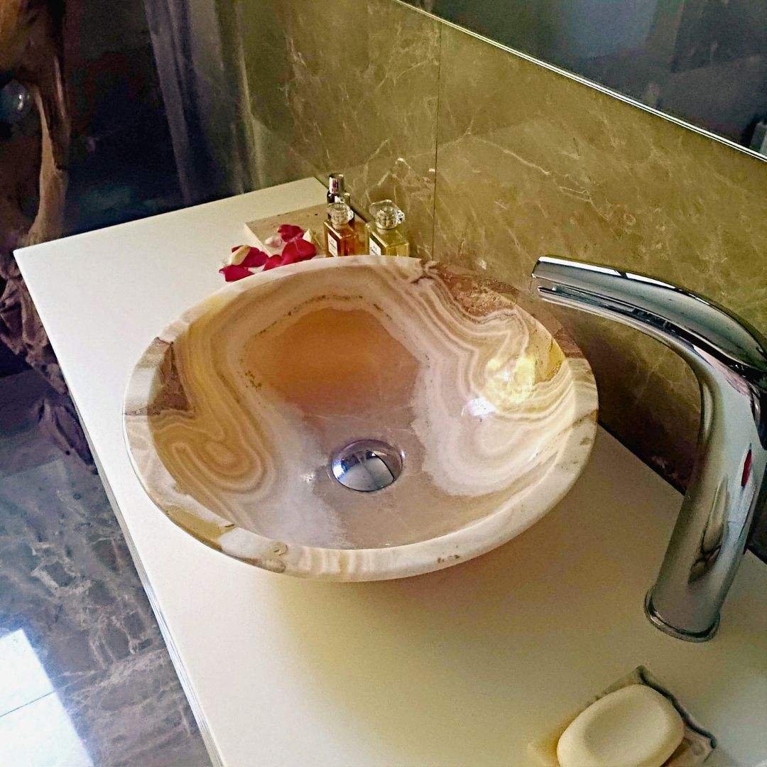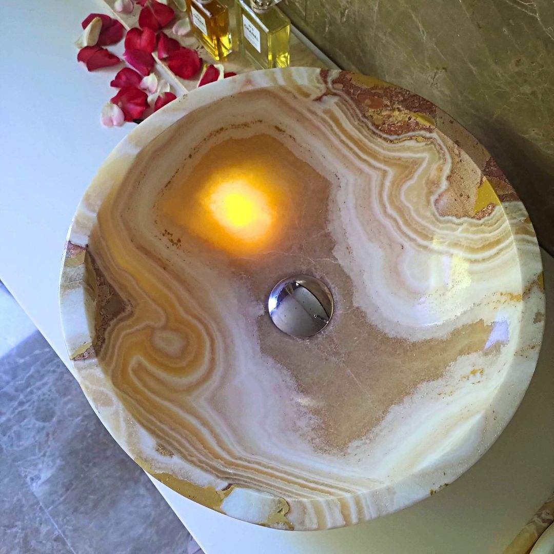 Ein handgefertigtes Waschbecken aus Onyx Miel Nougat, mit meisterhafter Präzision bearbeitet, ist weit mehr als nur ein funktionales Element – es ist ein Symbol für Raffinesse und Exklusivität. Jedes Exemplar ist einzigartig, reflektiert die natürliche Schönheit und die sich ständig wandelnde Essenz des Lichts.