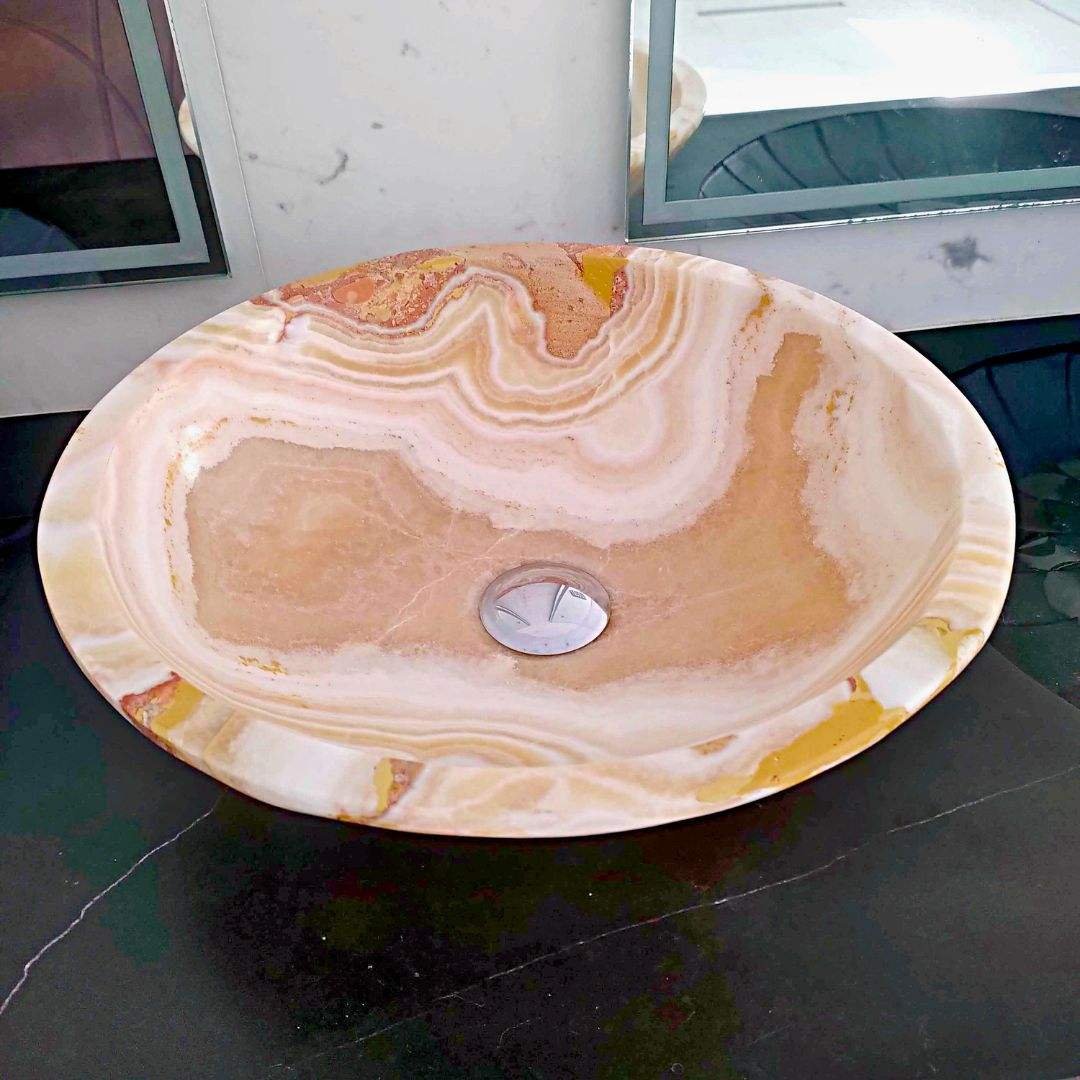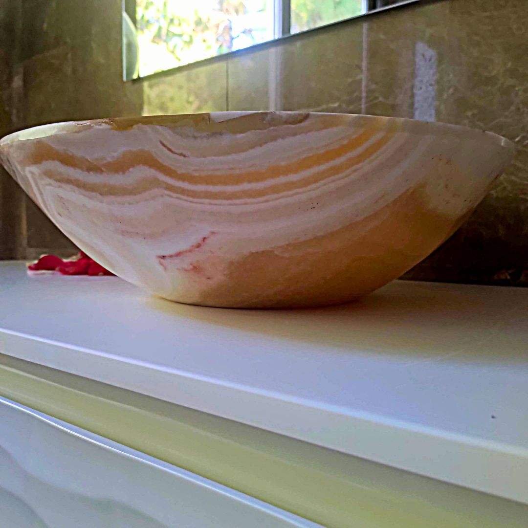 Onyx Miel Nougat: Dieser bemerkenswerte Onyx ist berühmt für seine Fähigkeit, Licht zu erfassen und zu transformieren. Seine warme Orangetönung, mit sanften Creme- und Weißnuancen, erstrahlt auf einzigartige Weise unter verschiedenen Lichtverhältnissen und schafft ein ständiges Gefühl der Veränderung. Von einem zarten, transluzenten Schimmer bei geringer Beleuchtung bis hin zu einem intensiven bernsteinfarbenen Glanz, wenn das Licht durch ihn hindurchdringt – dieser Onyx ist ein natürliches Kunstwerk in ständiger Evolution.