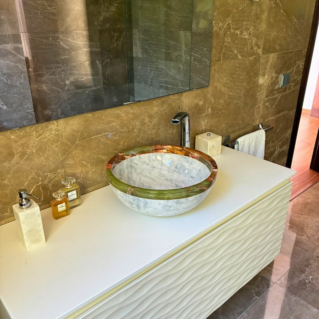Each bowl is hand-carved by expert artisans who highlight the luminosity of the white marble and the unique veining of the onyx. The result is a functional yet decorative basin that elevates any bathroom with timeless elegance.