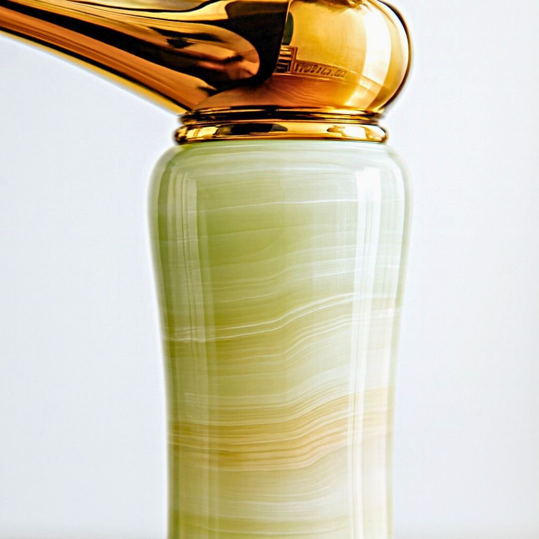 Ce robinet vasque haut associe un laiton poli à un onyx vert clair naturel pour apporter une présence apaisante et raffinée dans la salle de bain. La base en pierre révèle de douces variations de couleur et de fines lignes horizontales, donnant à chaque pièce une identité minérale unique. Sa teinte vert pâle s’harmonise facilement avec de nombreux styles d’intérieur, des tons neutres chaleureux aux surfaces minérales plus froides.