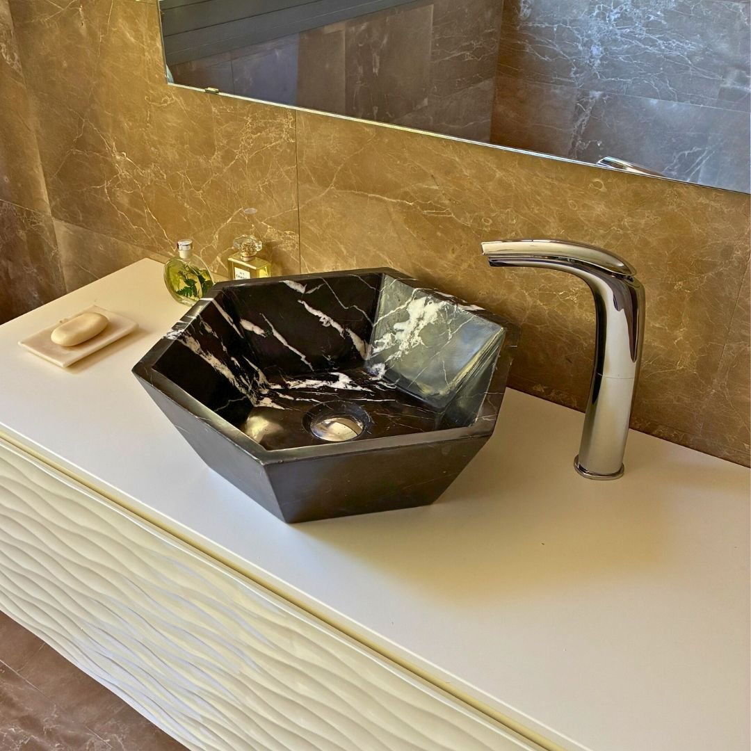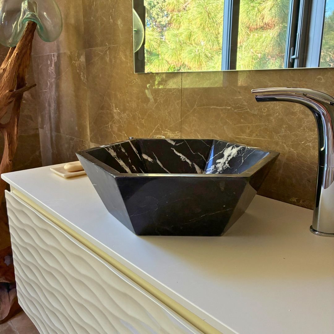 Este lavabo de encimera en mármol negro es una pieza de diseño que transforma el baño en un espacio sofisticado y contemporáneo. Su forma hexagonal, poco convencional y de líneas definidas, aporta una estética arquitectónica que destaca por su fuerza visual.