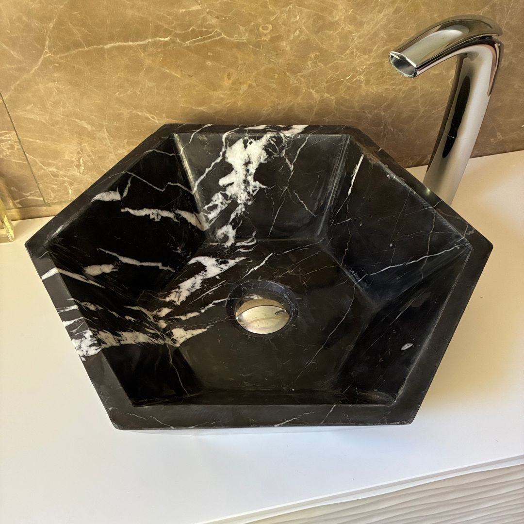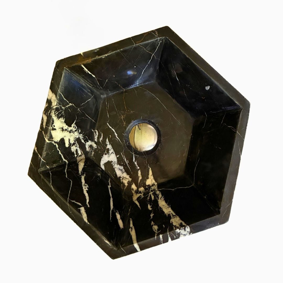 Tallado en mármol natural de tono negro intenso, este lavabo se distingue por sus vetas doradas que recorren la superficie con elegancia, creando un contraste impactante y lleno de carácter. El acabado pulido realza la profundidad del color y aporta una textura suave al tacto, mientras que la geometría hexagonal refuerza su presencia escultural.