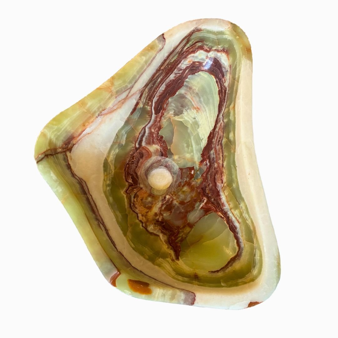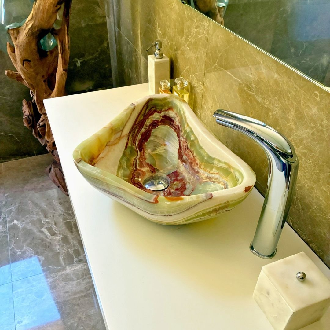 Lavabo de ónix verde triangular diseñado para instalación sobre encimera, una pieza artesanal que combina lujo y funcionalidad. Su forma irregular en triángulo aporta un carácter escultórico, convirtiéndolo en el centro visual de cualquier baño.