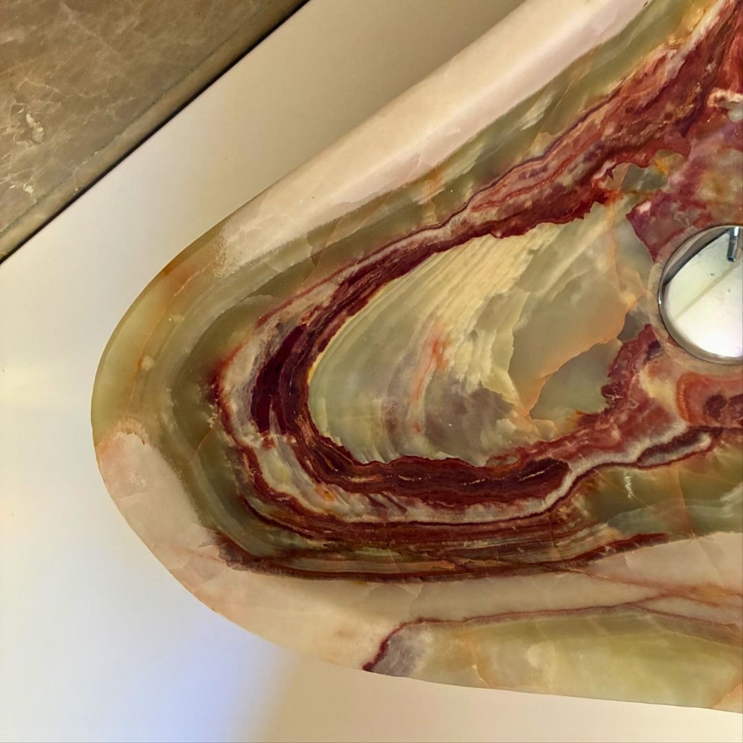 El ónix verde destaca por sus vetas naturales en tonos esmeralda, crema y rojo intenso, creando un contraste único en cada lavabo. La superficie pulida refleja la elegancia de la piedra, mientras que las paredes rugosas conservan un acabado rústico que subraya su autenticidad.
