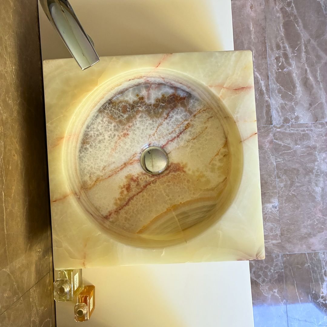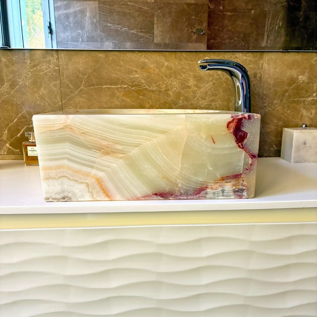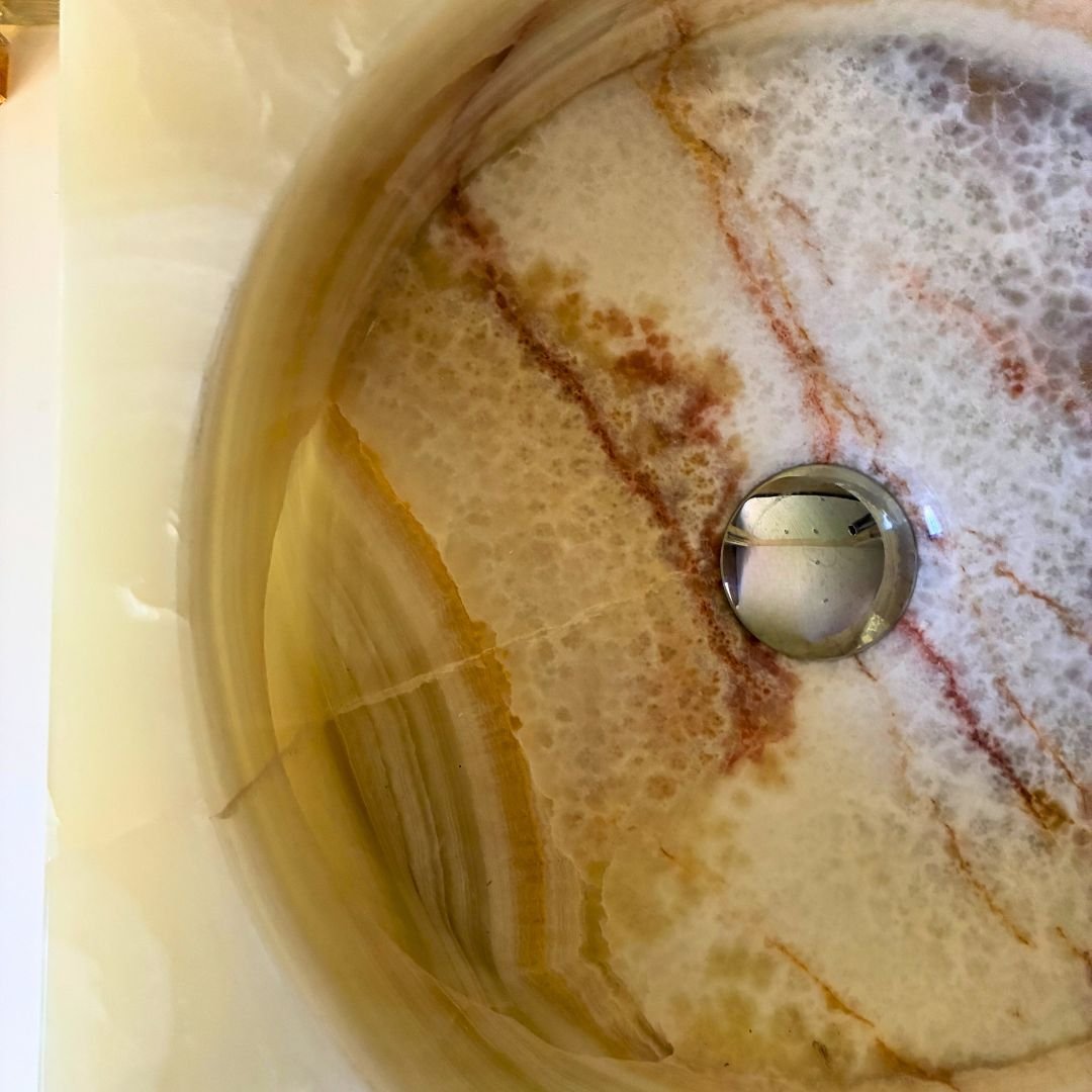 Onyxen som används i detta handfat utmärker sig genom sina mjuka nyanser – ljusgröna toner med inslag av bärnsten, karamell eller rosa – som vävs samman i organiska mönster. Ytan är visuellt rik och silkeslen vid beröring. Under både naturligt och konstgjort ljus får materialet liv och avslöjar inre lager som framhäver onyxens naturliga skönhet.