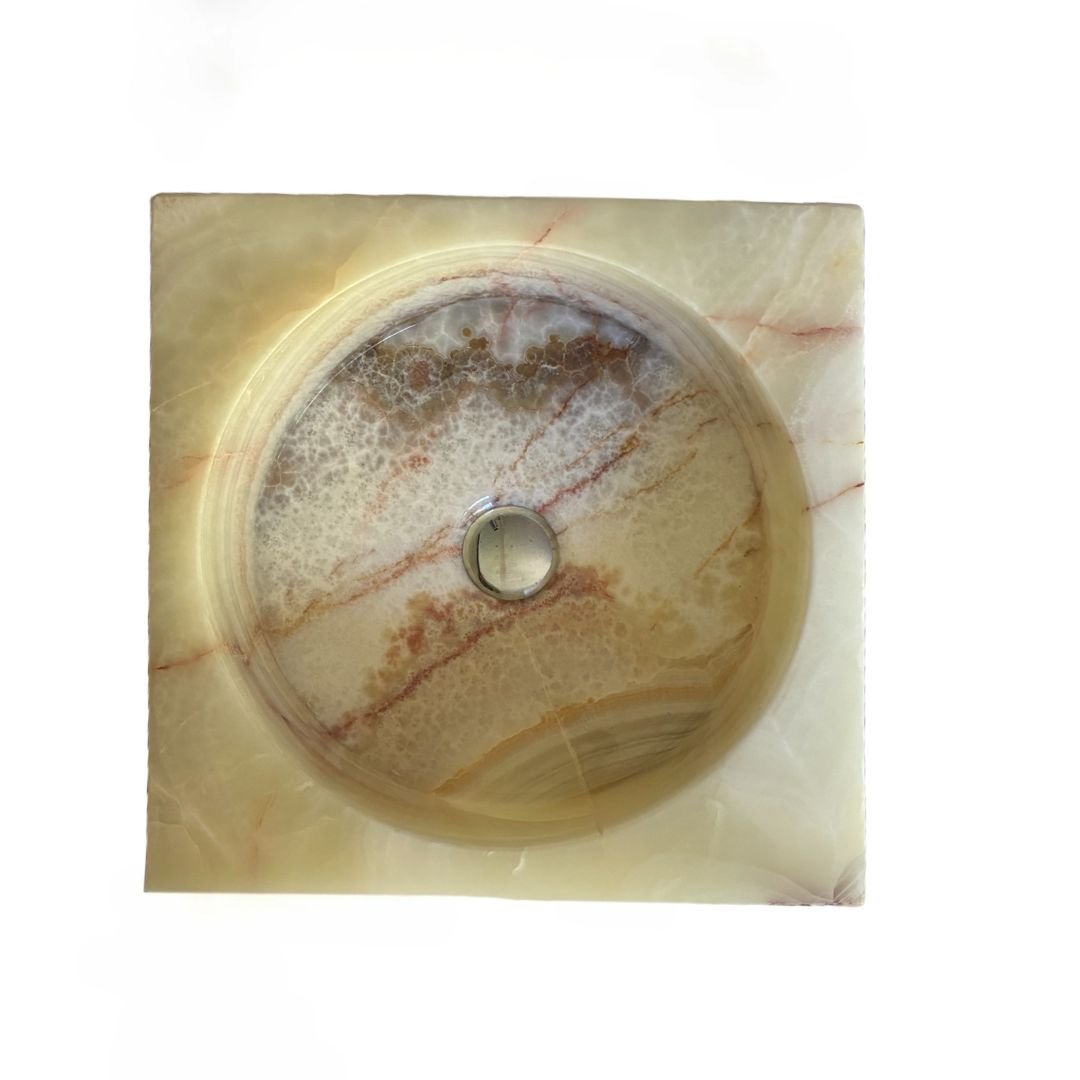 Tillverkat i semiprecious sten, avslöjar varje exemplar unika mönster och en naturlig genomskinlighet som förvandlar ljus till textur. Resultatet är ett visuellt djupt och varmt uttryck som lyfter hela badrummets atmosfär. Den geometriska formen med balanserade proportioner passar perfekt till moderna badrumsmöbler och fungerar som ett estetiskt blickfång med stark visuell effekt.